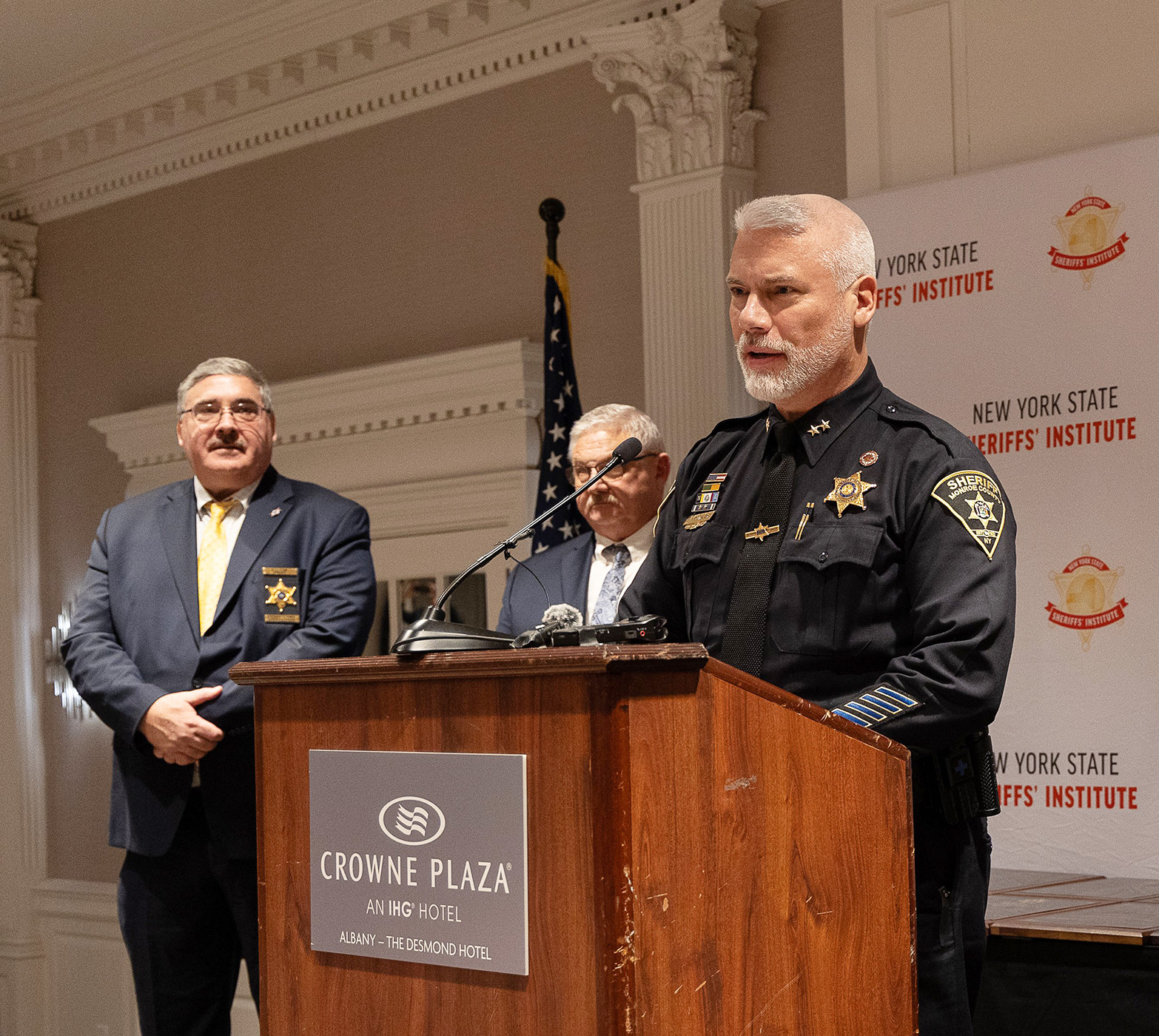 Monroe County Sheriff’s Office Chief Deputy Michael Fowler (at the podium) was this year’s recipient of the New York State Sheriffs’ Institute Carl Draxler Award. Named in honor of the late Chemung County Sheriff Carl Draxler, Chief Fowler embodies the characteristics deserving of this award: exceptional career achievement, selfless public service, and conscientious devotion to duty.