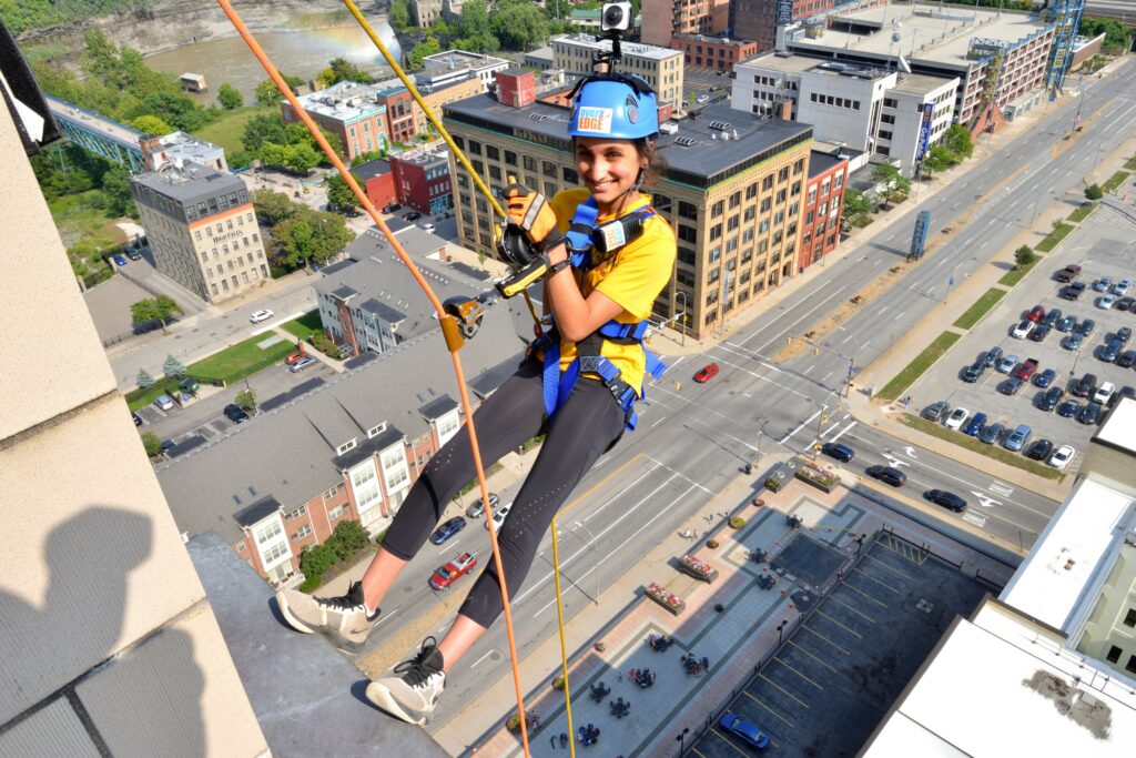 The Seneca Waterways Council partnered with Over the Edge, a company that conducts extreme rappelling events all over North America. “We’re incredibly proud to have reached this significant milestone,” says Stephen Hoitt, Scout Executive/CEO of Seneca Waterways Council. ”The experience, trepidation and excitement that a Scout feels atop a 30-foot climbing wall at summer camp is very similar to what these volunteers felt when they leaned back over the balcony, 240 feet above the ground.”