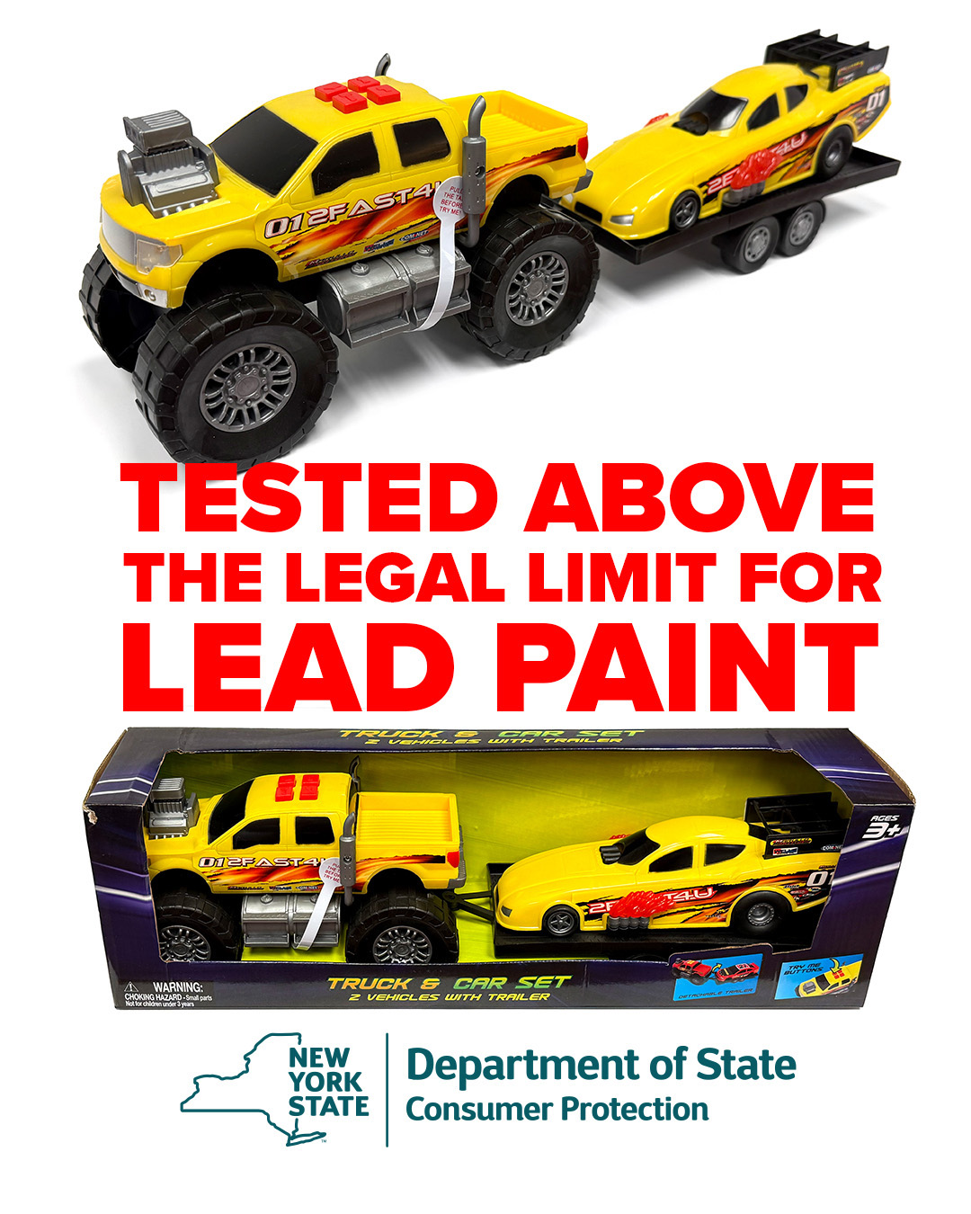 The New York Department of State’s Division of Consumer Protection is calling for the Federal Government to investigate the Truck & Car Set: 2 Vehicles with Trailer toy and test for a national recall. The toy is distributed by Old East Main Co. and was sold at Dollar General stores throughout New York State. Research and testing found the red and gray surface coating of this toy contains inconsistent lead levels – in certain samples up to 11 times the allowable paint and surface coating lead level established by the federal Consumer Product Safety Improvement Act. The Division is also warning holiday shopping consumers about the health hazards the lead paint found on the Truck and Car Set toy presents to children.